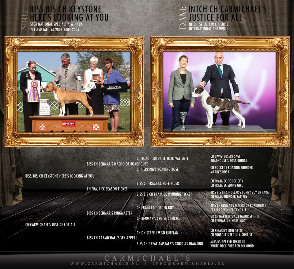 We want to introduce our 2020 litter, its a result of 15 years old frozen semen from Bruno. 'Bruno' was three years in a row the number #1 amstaf from the US, as also the National Speciality Winner in 2003-2004-2005.